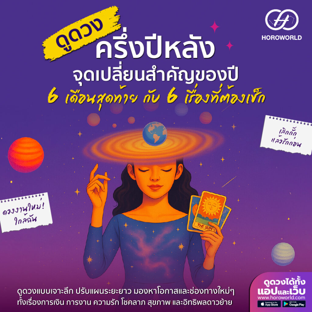 เพราะบางอย่างที่วางแผนเอาไว้ก็อาจจะไม่ได้เป็นไปอย่างที่เราคาดหวัง บางคนก็อาจจะเจอกับปัญหาเก่า ๆ วนกลับมาให้แก้แล้วแก้อีก และบางครั้งชีวิตก็เล่นละครสู้เรา! บางวันก็ดิ่งดาวน์ บางวันก็ปัง ชีวิตพลิกและเจอกับโอกาสใหม่ ๆ ที่มาแบบไม่ทันตั้งตัว การดูดวงในช่วงครึ่งปีหลังก็เลยกลายเป็น ‘ไกด์นำทาง’ เพื่อให้เราได้เห็นภาพรวม และการวางแผนใช้ชีวิตแบบมีสติและตั้งรับได้ทัน เพื่อให้ช่วงท้ายปี เป็นจังหวะชีวิตที่กลับมาเฉิดฉายอีกครั้ง