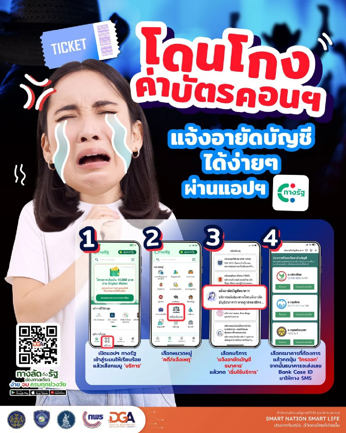 DGA เปิดช่องทางตามเงินคืน แจ้งอายัดบัญชีธนาคาร ผ่านแอปทางรัฐ ไม่ให้โดนโกงอีก ป้องกันมิจฉาชีพ คนโกงรายวัน โดยเฉพาะซื้อบัตรคอนเสิร์ตปลอม บัตรแพง แถมไม่ได้ดูคอนเสิร์ต