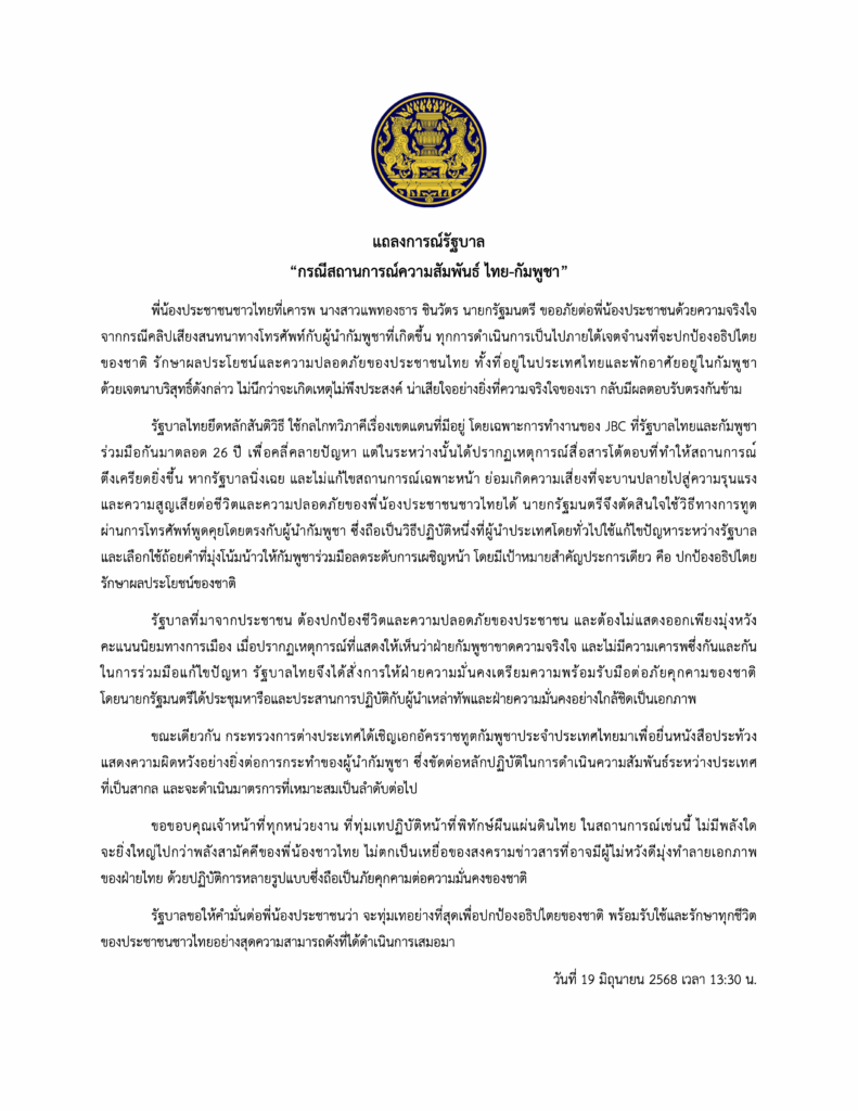 ที่มา : รัฐบาล ออกแถลงการณ์ปมความสัมพันธ์ไทย-กัมพูชา สั่งพร้อมรับมือภัยคุกคาม