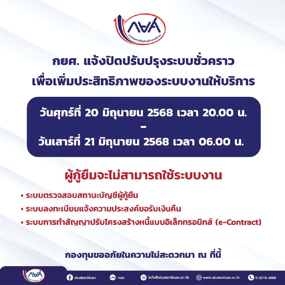 เริ่มวันนี้ "ปิดปรับปรุงระบบชั่วคราว" กระทบใครบ้าง กยศ. แจ้งปิดระบบ 10 ชั่วโมงเต็ม ผู้กู้ยืมเข้าไม่ได้ทั่วไทย ตรวจสอบสถานะบัญชี - ลงทะเบียนขอรับเงินคืน - ปรับโครงสร้างหนี้ เปิดระบบให้ใช้ปกติกี่โมง เช็กเลย