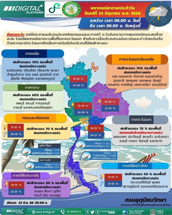 วันที่ 23 มิ.ย.2568 กรมอุตุนิยมวิทยา พยากรณ์อากาศ 24 ชั่วโมงข้างหน้า ประเทศไทยมีฝนตกหนักบางแห่ง โดยมีฝนตกหนักมากบางพื้นที่ในภาคตะวันออก ขอให้ประชาชนในบริเวณดังกล่าวระวังอันตรายจากฝนตกหนักถึงหนักมากและฝนที่ตกสะสม ซึ่งอาจทำให้เกิดน้ำท่วมฉับพลัน น้ำป่าไหลหลากและดินโคลนถล่ม โดยเฉพาะพื้นที่ลาดเชิงเขาใกล้ทางน้ำไหลผ่านและพื้นที่ลุ่ม