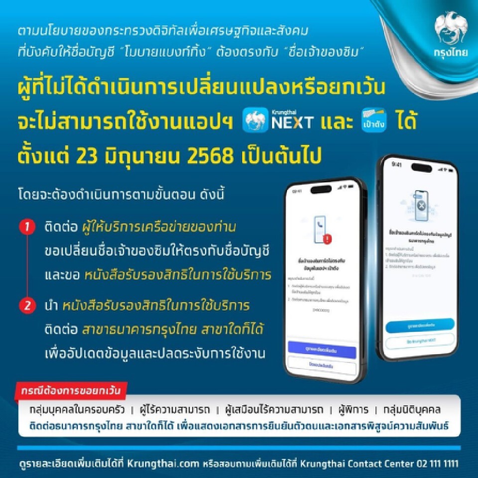 วันจันทร์ที่ 23 มิถุนายน 2568 ผู้สื่อข่าวรายงานว่า เพจ Krungthai Care ของธนาคารกรุงไทย ได้โพสต์ข้อความว่า ตามนโยบายของกระทรวงดิจิทัลเพื่อเศรษฐกิจและสังคม ที่บังคับให้ชื่อบัญชี “โมบายแบงก์กิ้ง” ต้องตรงกับ “ชื่อเจ้าของซิม” ใน ลูกค้ากลุ่ม Phase 1 ที่ได้รับ Notification