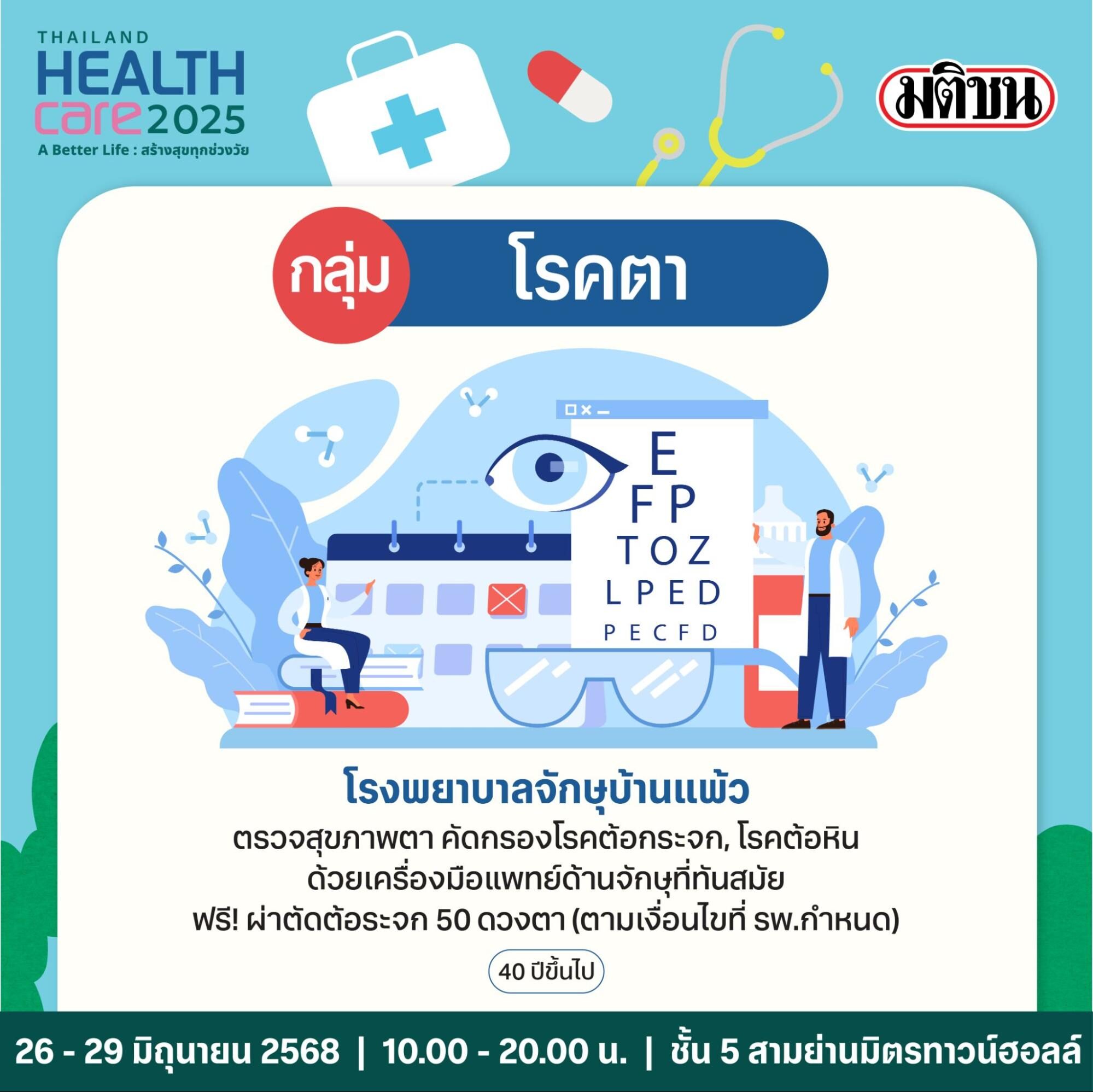 ตรวจสุขภาพตา, คัดกรองโรคต้อกระจก, โรคต้อหิน ด้วยเครื่องมือแพทย์ด้านจักษุที่ทันสมัย พิเศษที่งาน Thailand Healthcare 2025 รับฟรี ผ่าตัดต้อระจก 50 ดวงตา ให้บริการวันละ 50 ราย เช้า 15 ราย บ่าย 35 ราย รวม 4 วัน 200 ราย โดยโรงพยาบาลจักษุบ้านแพ้ว ช่วงอายุแนะนำ คือ 40 ปีขึ้นไป