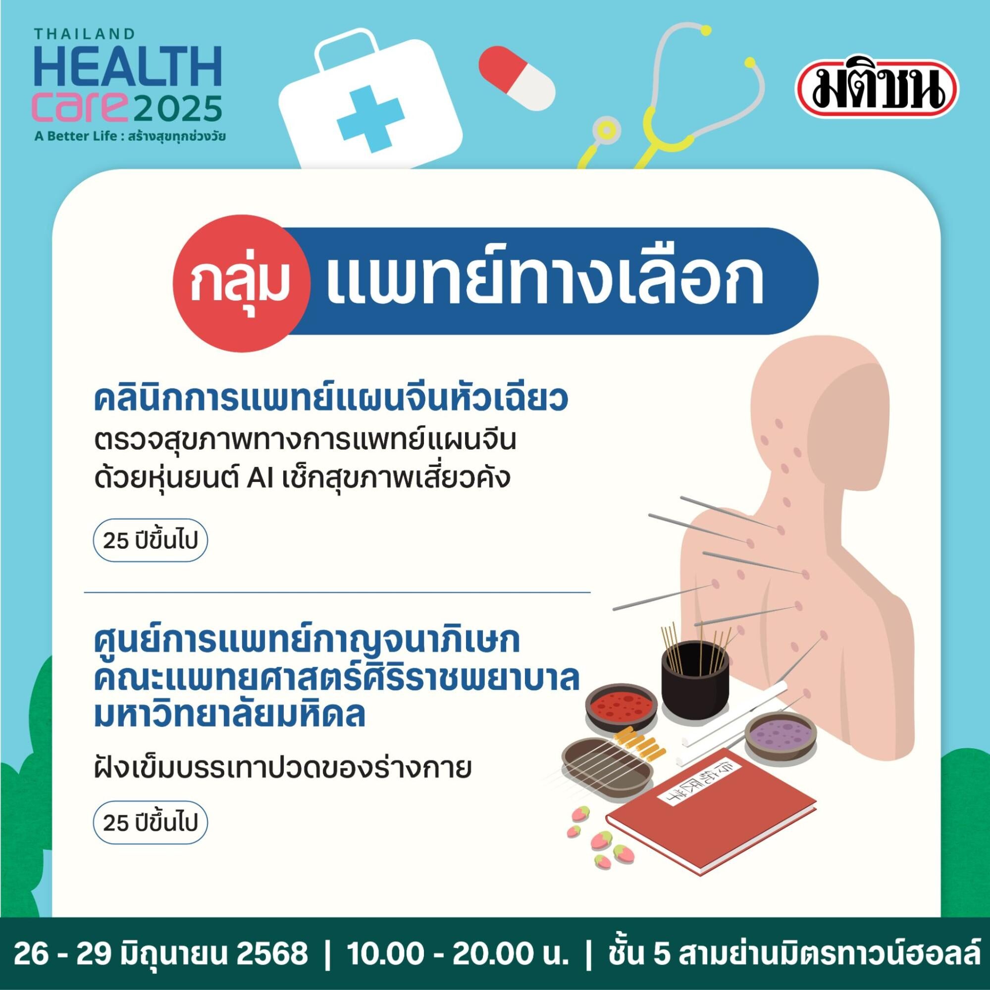 Thailand Healthcare 2025 ในธีม ‘A Better Life : สร้างสุขทุกช่วงวัย’ จัดยาว 4 วัน วันที่ 26-29 มิถุนายน 2568 เวลา 10.00-20.00 น. ที่ชั้น 5 สามย่านมิตรทาวน์ฮอลล์ เดินทางสะดวกด้วยรถไฟฟ้า MRT สถานีสามย่าน ทางออกที่ 2