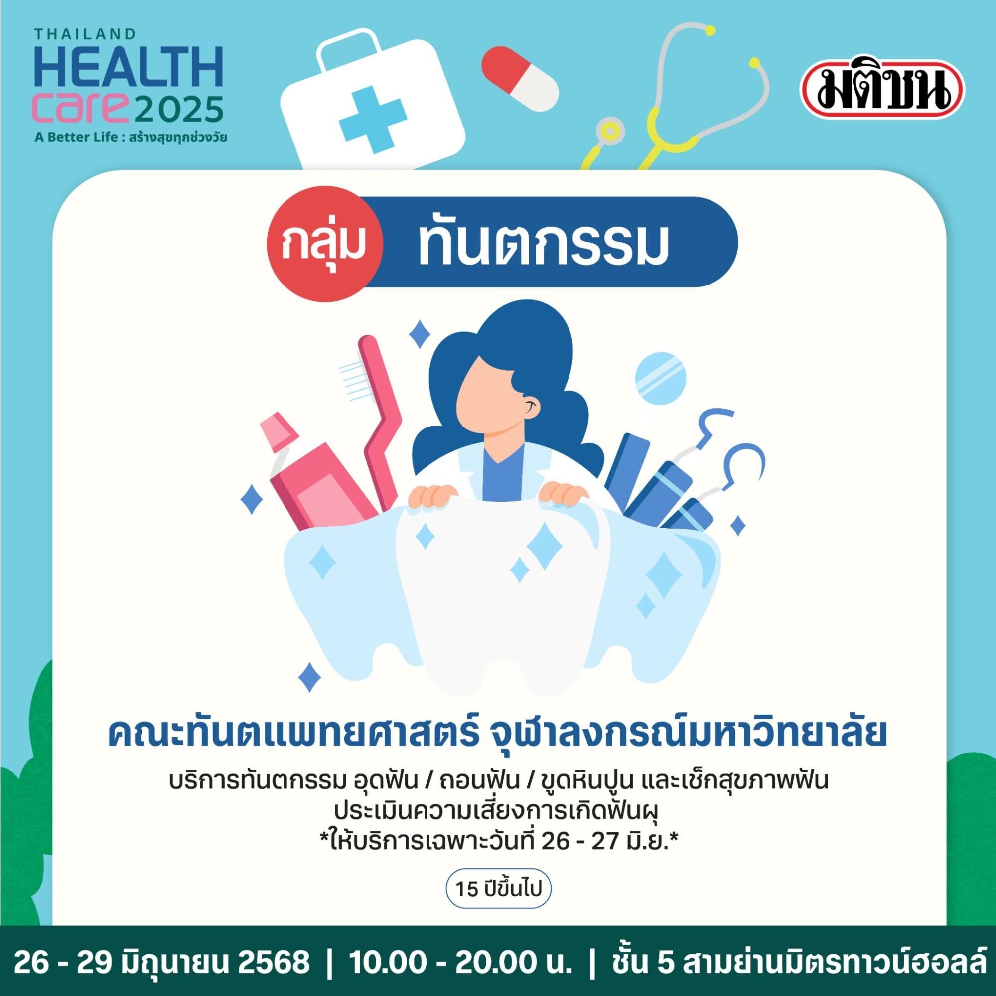 หมายเหตุ: รายการทันตกรรม โดยคณะทันตแพทยศาสตร์ จุฬาลงกรณ์มหาวิทยาลัย มาให้บริการเฉพาะวันพฤหัสบดีที่ 26 และวันศุกร์ที่ 27 มิถุนายน 2568 เท่านั้น