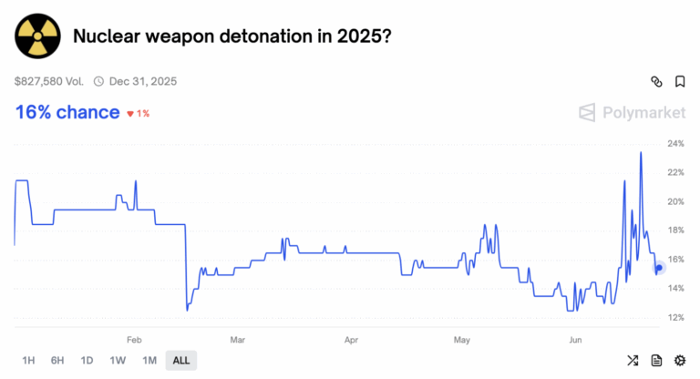 ล่าสุด เมื่อวันที่ 13 มิถุนายนที่ผ่านมา แพลตฟอร์มทำนายผลแบบกระจายศูนย์ (Decentralized Prediction Market) ชื่อดังอย่าง Polymarket ได้เปิดเผยชุดข้อมูลที่น่าตกใจ โดยประเมินว่าโอกาสที่ “จะมีการใช้อาวุธนิวเคลียร์บนโลกภายในปี 2025” นั้น สูงถึง 16% หรือเทียบเท่ากับ 1 ใน 6 ซึ่งถือเป็นตัวเลขที่มากพอจะทำให้เกิดความกังวลในวงกว้าง
