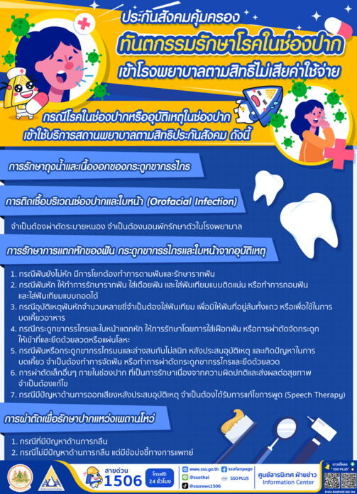 อีกทั้งเพิ่มการเข้าถึงทุกบริการทันตกรรมในสถานพยาบาลรัฐทุกแห่ง โดยผู้ประกันตนไม่ต้องสำรองจ่าย หากมีข้อสงสัยสามารถสอบถามข้อมูลเพิ่มเติม ได้ที่สำนักงานประกันสังคมกรุงเทพมหานครพื้นที่/จังหวัด/สาขาทั่วประเทศ เว็บไซต์สำนักงานประกันสังคม www.sso.go.th หรือสายด่วนประกันสังคม 1506 โทรฟรีตลอด 24 ชั่วโมง
