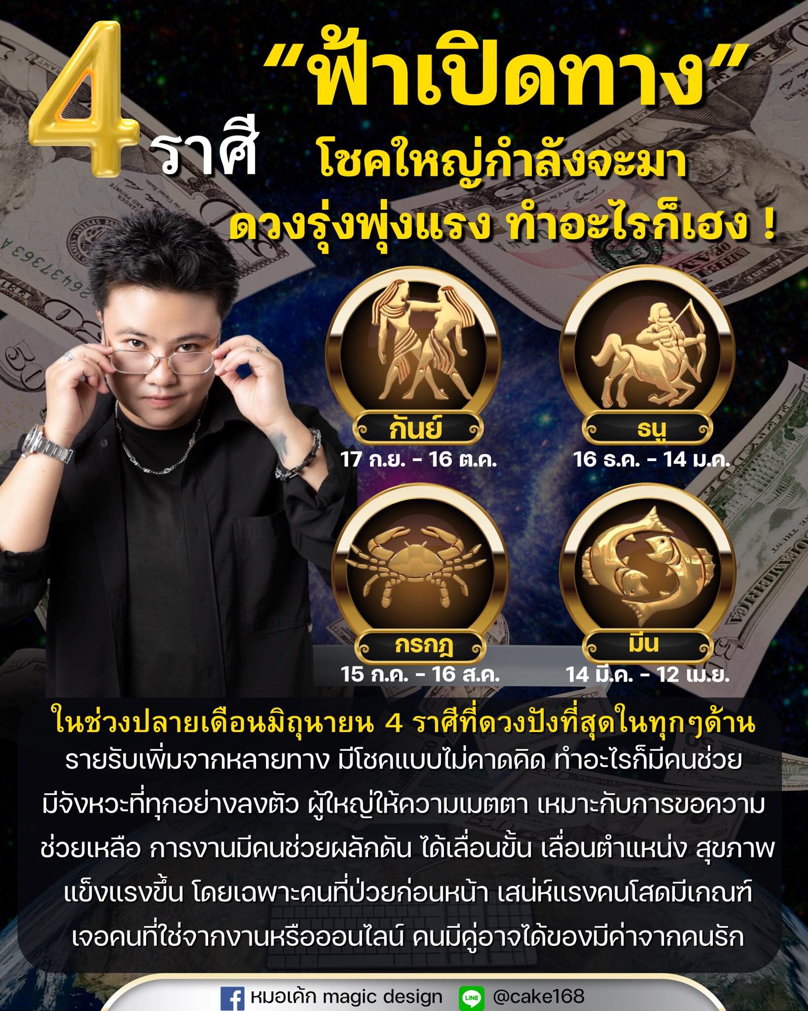 หมอเค้กMagicdesign เผยถึงดวงชะตาราศี ฟ้าเปิดทาง โชคใหญ่กำลังมา ดวงรุ่งพุ่งแรง ทำอะไรก็เฮง ช่วงปลายเดือนมิ.ย. ราศีที่ดวงปังสุดทุกด้าน รายรับเพิ่มหลายทาง มีโชคแบบไม่คาดคิด ทำอะไรก็มีคนช่วย มีจังหวะที่ทุกอย่างลงตัว ผู้ใหญ่ให้ความเมตตา เหมาะกับการขอความช่วยเหลือ การงานมีคนช่วยผลักดัน ได้เลื่อนขั้น เลื่อนตำแหน่ง สุขภาพแข็งแรงขึ้น