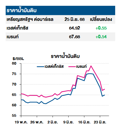 หน่วยวิเคราะห์สถานการณ์ราคาน้ำมัน บมจ.ไทยออยล์ ระบุว่า ปัจจัยที่ส่งผลกระทบกับราคามีดังนี้ ราคาน้ำมันดิบปรับเพิ่มขึ้น 1% จากก่อนหน้านี้ที่ปรับลดลงอย่างรุนแรงในช่วงต้นสัปดาห์ หลังสำนักงานสารสนเทศด้านพลังงานสหรัฐ (EIA) เปิดเผยตัวเลขน้ำมันดิบคงคลังสหรัฐ ประจำสัปดาห์สิ้นสุด ณ วันที่ 20 มิ.ย. 68 ปรับลดลง 5.8 ล้านบาร์เรล สู่ระดับ 415.1 ล้านบาร์เรล ซึ่งปรับลดลงมากกว่าที่นักวิเคราะห์คาดการณ์ว่าจะปรับลดลงเพียง 0.79 ล้านบาร์เรล สะท้อนถึงความต้องการใช้น้ำมันในสหรัฐที่ยังคงแข็งแกร่ง