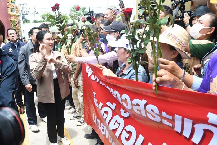 โดยมีประชาชนถือป้ายข้อความ “ชาวสระแก้วพร้อมที่จะสู้ไปกับนายกฯแพทองธาร, ชาวสระแก้วเป็นกำลังใจให้นายกฯ, นายกฯ อุ๊งอิ๊ง สู้สู้ จากชาวสระแก้ว พร้อมกับมอบดอกกุหลาบให้กำลังใจนายกฯ ในการทำงาน