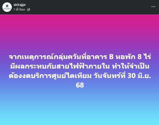 ศิริราช แจ้งงดบริการศูนย์ไตเทียม 30 มิ.ย. เผยสายไฟฟ้าภายใน เจอผลกระทบเหตุกลุ่มควันในหอพัก 8 ไร่ อาคาร B