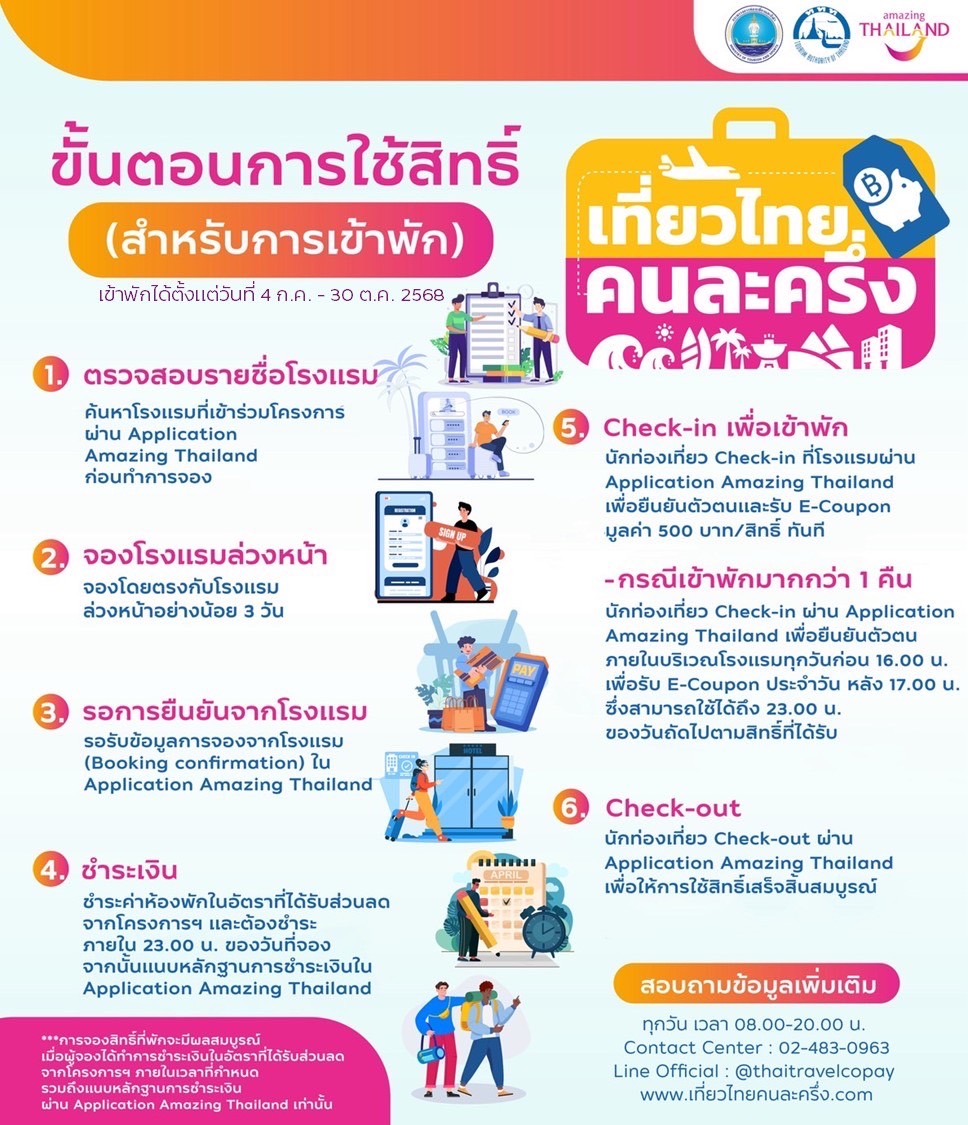 ที่มา : ขั้นตอนการใช้สิทธิ์ "เที่ยวไทยคนละครึ่ง" เพื่อเข้าพักโรงแรม