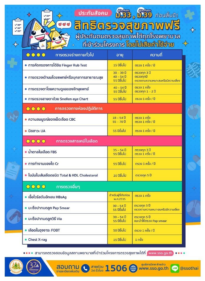 การตรวจสุขภาพของผู้ประกันตน ในสิทธิประกันสังคมตามมาตรา 33 และ มาตรา 39 สามารถตรวจสุขภาพฟรี ได้ทุกโรงพยาบาลที่เข้าร่วมโครงการ โดยไม่เสียค่าใช้จ่าย ภายในเดือนธันวาคม 2568 นี้