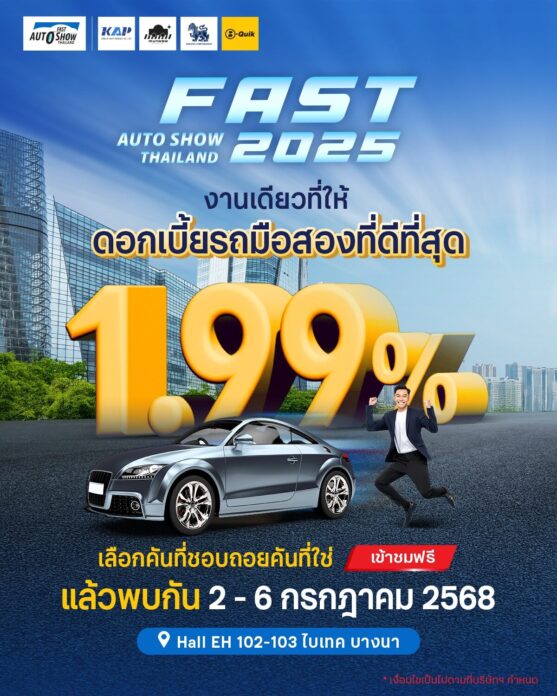 งาน “ฟาสต์ ออโต โชว์ ไทยแลนด์ 2025” จะจัดขึ้นระหว่าง วันที่ 2 – 6 ก.ค. นี้ ที่ศูนย์นิทรรศการและการประชุมไบเทค บางนา ฮอลล์ 102 – 103 “เลือกคันที่ชอบ ถอยคันที่ใช่” ภายใต้คอนเซ็ปท์ “รถใหม่โปรโดนใจ รถมือสองไมล์แท้รับประกันซื้อคืน” เข้าชมฟรี! ไม่มีค่าใช้จ่าย