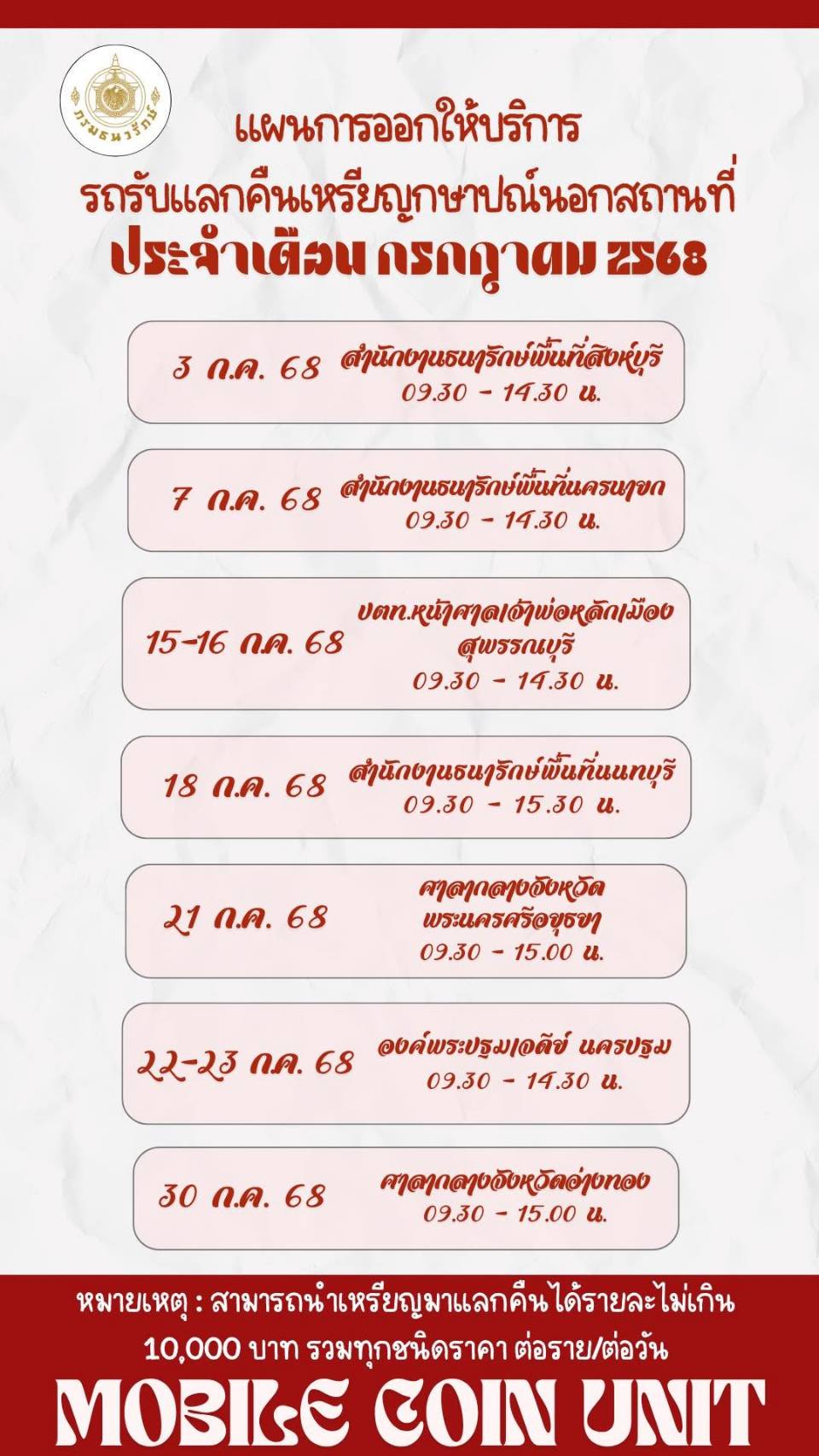 กรมธนารักษ์นำรถรับแลกคืนเหรียญกษาปณ์เคลื่อนที่ (Mobile Coin Unit) ให้บริการรับแลกคืนเหรียญกษาปณ์แก่ประชาชน ประจำเดือน ก.ค. 68 เพื่อกระตุ้นให้เหรียญกษาปณ์เกิดการหมุนเวียนเพิ่มมากขึ้น