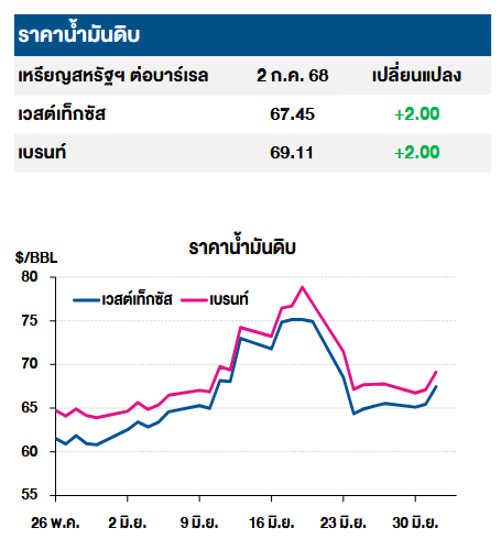 โดยราคาน้ำมันดิบเวสต์เทกซัสซื้อขายเมื่อ 2 ก.ค. 2568 อยู่ที่ 67.45 เหรียญสหรัฐต่อบาร์เรล เพิ่มขึ้น +2.00 เหรียญสหรัฐ และราคาน้ำมันดิบเบรนต์อยู่ที่ 69.11 เหรียญสหรัฐต่อบาร์เรล เพิ่มขึ้น +2.00 เหรียญสหรัฐต่อบาร์เรล