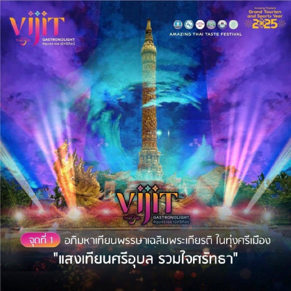นอกจากนี้ ททท.และพันธมิตรยังได้จัดงาน VIJIT GASTRONOLIGHT @อุบลราชธานีศรีศิลป์ ที่มาพร้อมแนวคิด“วิจิตรแสงศรัทธา เมืองธรรมรุ่งเรือง” โดยมี 11 จุดการแสดง Projection Mapping & Lighting ที่ชวนให้มาสัมผัสเสน่ห์เมืองอุบลผ่านแสงไฟ โดยงานนี้จัดขึ้นระหว่างวันที่ 7-16 กรกฎาคม 2568 ตั้งแต่เวลา 18.00 -23.00 น. ณ เมืองอุบลราชธานี ซึ่งพิกัดทั้ง 11 จุดการแสดงจะมีที่ไหนบ้างนั้น สามารถตรวจสอบได้ที่นี่