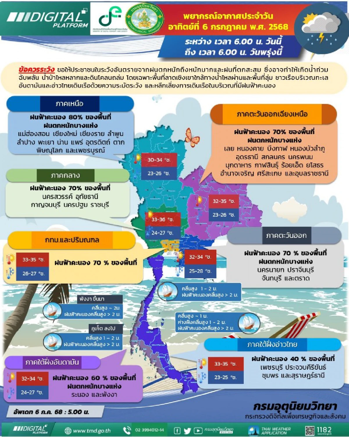 กรมอุตุ พยากรณ์อากาศวันนี้ 6 ก.ค.68 สภาพอากาศวันนี้ เตือน “มรสุมเข้าไทย”แรงขึ้น ภาคเหนือ อีสาน ตะวันออก โดนหนัก ฝนตกสูงสุด 80% ส่วนกทม. โดนเต็มๆ มีฝนฟ้าคะนอง ร้อยละ 70