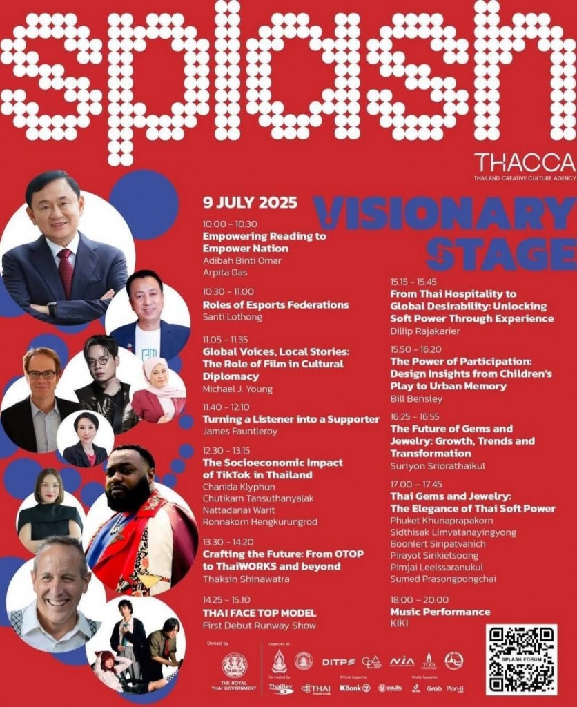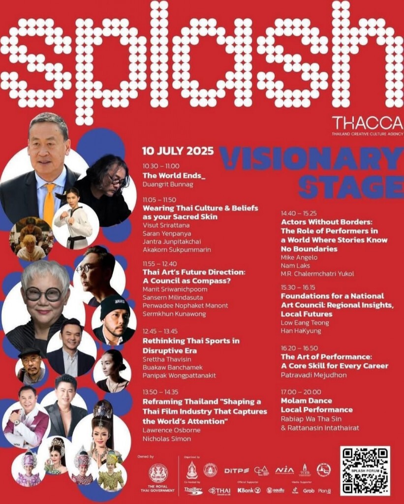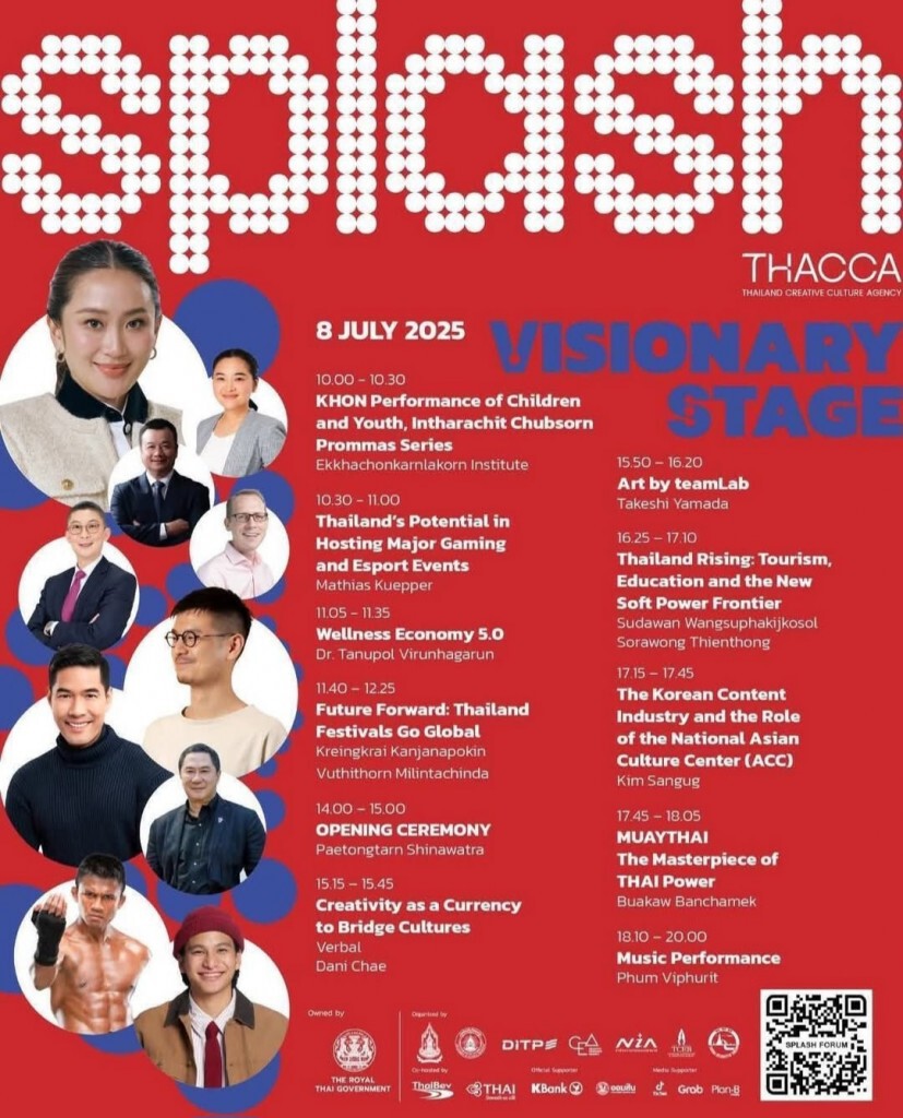 รัฐบาลไทย ร่วมกับ สำนักงานส่งเสริมวัฒนธรรมสร้างสรรค์ (THACCA) จัดงาน Soft Power ที่ใหญ่ที่สุดในเอเชียตะวันออกเฉียงใต้ “SPLASH – Soft Power Forum 2025” ระหว่างวันที่ 8-11 กรกฎาคม 2568 เวลา 10.00-20.00 Hall 1-4 ศูนย์การประชุมแห่งชาติสิริกิติ์