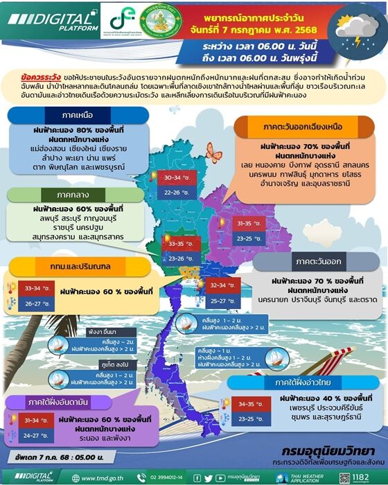 วันที่ 7 ก.ค.2568 กรมอุตุนิยมวิทยา พยากรณ์อากาศ 24 ชั่วโมงข้างหน้า ภาคเหนือ ภาคตะวันออกเฉียงเหนือ ภาคตะวันออก และภาคใต้มีฝนตกหนักบางแห่ง ขอให้ประชาชนในบริเวณจังหวัดภาคเหนือ ภาคตะวันออกเฉียงเหนือ ภาคตะวันออก และภาคใต้ ระวังอันตรายจากฝนตกหนัก และฝนที่ตกสะสม