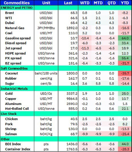 ส่วนด้านราคาสินค้าเกษตร กลับมาฟื้นตัวเล็กน้อย ทั้งราคาน้ำตาล +3.6%, ข้าวโพด +3.4%, ข้าวสาลี +3.0% และกากถั่วเหลือง +1.0% ขณะที่ราคาเนื้อสัตว์ พบว่า หมู ยังคงปรับลดลงอีก -2.5%w-w ถือเป็นการลดลง 4 สัปดาห์ติดต่อกัน ขณะที่ราคาไก่ เริ่มมีสัญญาณการฟื้นตัว โดยสัปดาห์ล่าสุดเริ่มปรับขึ้น +2.5% ทำจุดสูงสุดในรอบเกือบ 2 เดือน ดังนั้นอาจเห็นแรงเก็งกำไรในหุ้นกลุ่มเนื้อไก่มากขึ้น (GFPT)