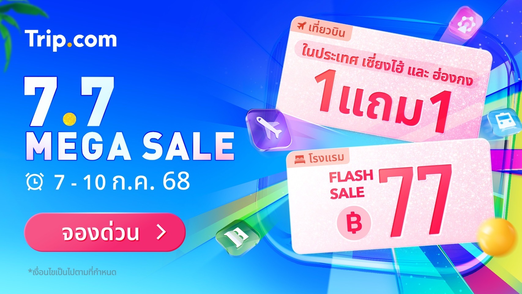 Trip.com ผู้ให้บริการด้านการท่องเที่ยวชั้นนำจัดแคมเปญ 7.7 Mega Sale ที่รวมดีลสุดคุ้มสำหรับการท่องเที่ยวสำหรับการจองโรงแรม เที่ยวบิน และสถานที่ท่องเที่ยวให้กับนักเดินทาง โปรโมชั่นนี้จะจัดขึ้นตั้งแต่วันที่ 7-10 กรกฎาคม 2568 ไฮไลต์เด็ดคือโรงแรมราคาเพียง 77 บาท ตั๋วเครื่องบินซื้อ 1 แถม 1 รวมถึงตั๋วเข้าสถานที่ท่องเที่ยวชั้นนำพร้อมดีลเช่ารถราคาพิเศษทั่วโลก