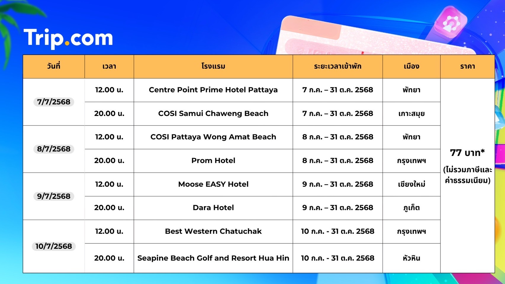 7.7 Mega Sale ปีนี้มาพร้อมดีลท่องเที่ยวสุดพิเศษที่คัดสรรมาอย่างดี สำหรับการจองโรงแรม ทาง Trip.com มี 8 โรงแรมที่คัดมาเป็นพิเศษราคาเพียงคืนละ 77 บาท ในช่วง Flash Sales เวลา 12.00 น. และ 20.00 น. ทุกวันตลอดระยะเวลาโปรโมชั่น
