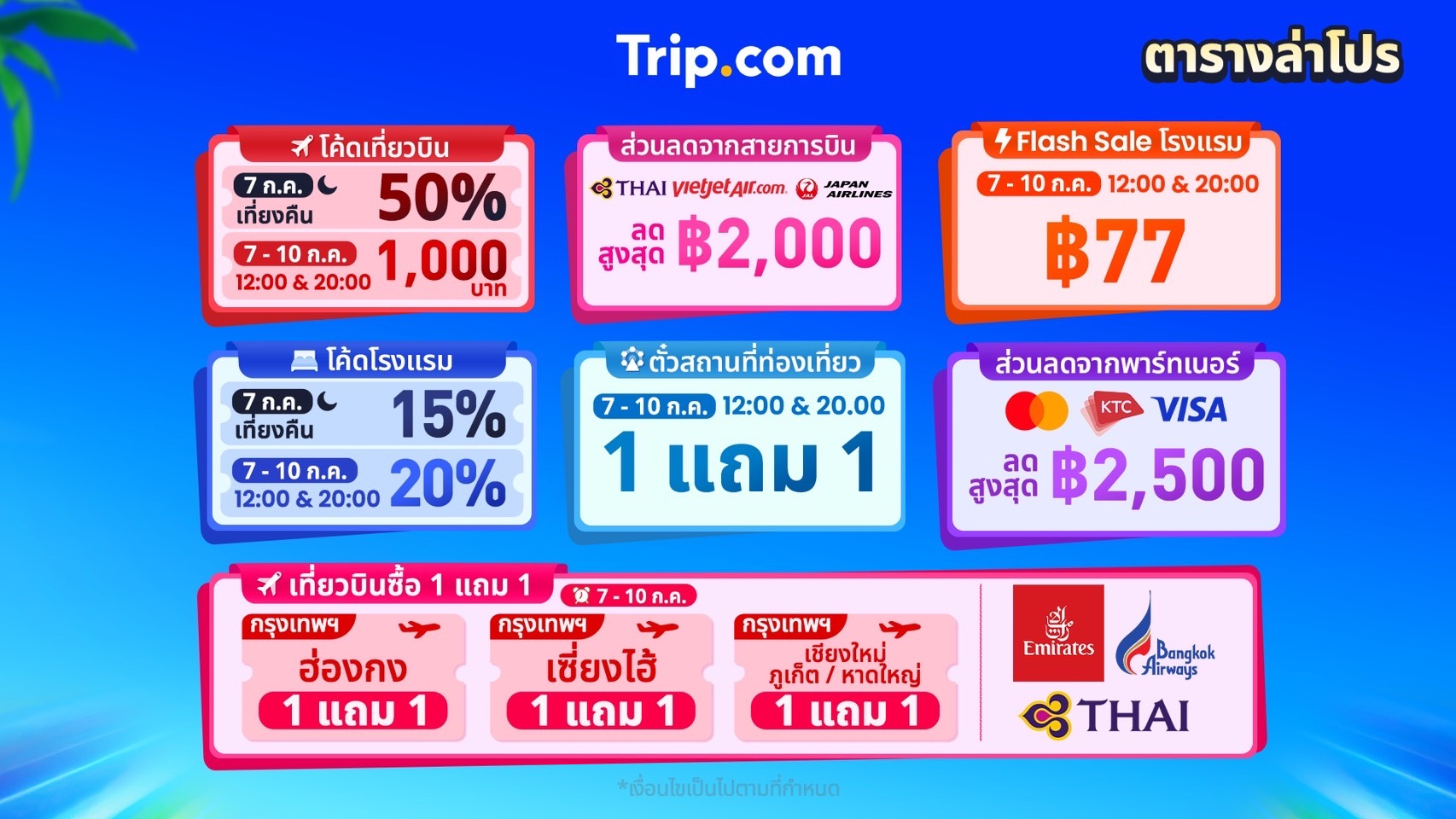 คูปองส่วนลดสำหรับจองเที่ยวบิน สามารถรับข้อเสนอพิเศษได้หลากหลายช่วงเวลา เริ่มตั้งแต่เที่ยงคืนวันที่ 7 กรกฎาคม ด้วยคูปองลด 100 บาท (จองขั้นต่ำ 500 บาท) หรือคูปองลด 50% (ลดสูงสุด 2,000 บาท) และช่วงเช้าเวลา 07.00 น. ยังมีส่วนลด 10% (ลดสูงสุด 500 บาท) ให้เลือกใช้อีกด้วย