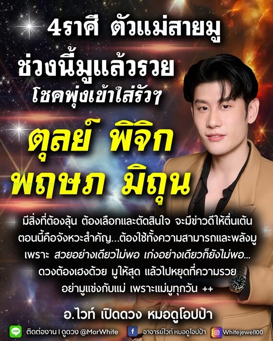 อ.ไวท์ หมอดูโอปป้า เปิดดวงชะตา 4 ราศี ตัวแม่สายมู ช่วงนี้มูแล้วรวย โชคพุ่งเข้าใส่ จะมีข่าวดีให้ตื่นเต้น ตอนนี้คือจังหวะสำคัญ ประกอบด้วย ราศีตุลย์ ราศีพิจิก ราศีพฤษภ และ ราศีมิถุน โดยมีรายละเอียดดังนี้