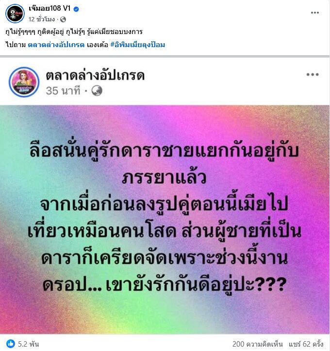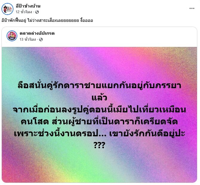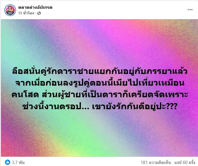 จากกรณี เพจ ตลาดล่างอัปเกรด โพสต์ข้อความปริศนาว่า “ลือสนั่นคู่รักดาราชายแยกกันอยู่กับภรรยาแล้ว จากเมื่อก่อนลงรูปคู่ตอนนี้เมียไปเที่ยวเหมือนคนโสด ส่วนผู้ชายที่เป็นดาราก็เครียดจัดเพราะช่วงนี้งานดรอป… เขายังรักกันดีอยู่ปะ???”