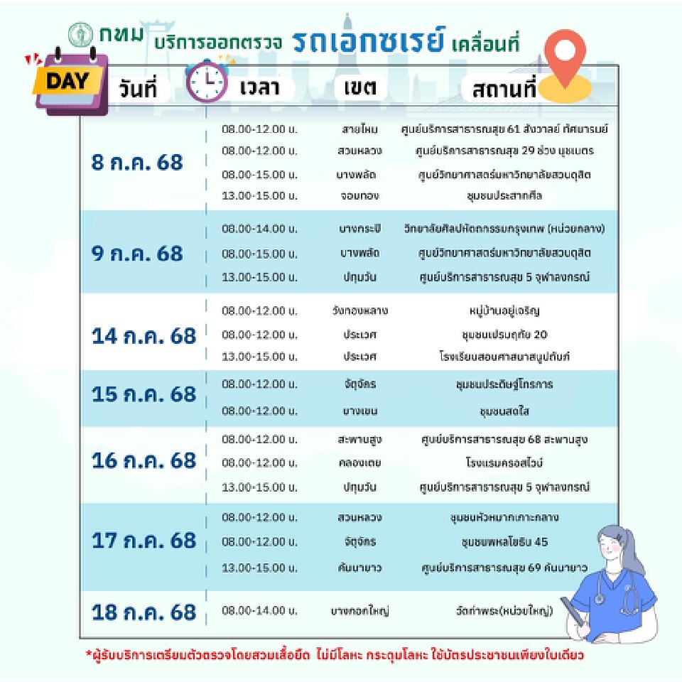 กรุงเทพมหานคร บริการออกตรวจรถเอกซเรย์เคลื่อนที่ประจำเดือนกรกฎาคม 2568 ใช้บัตรประชาชนเพียงใบเดียวสามารถรับบริการตรวจสุขภาพฟรีได้ทันที อาทิ ตรวจเอกซเรย์ปอด เพื่อคัดกรองความผิดปกติ, ตรวจคัดกรองมะเร็งสตรี รวมถึงบริการ ตรวจสุขภาพจิต ประเมินความเครียดและภาวะซึมเศร้า รวม 15 จุดทั่ว กทม. ระหว่างวันที่ 9, 14 - 18 กรกฎาคม 2568
