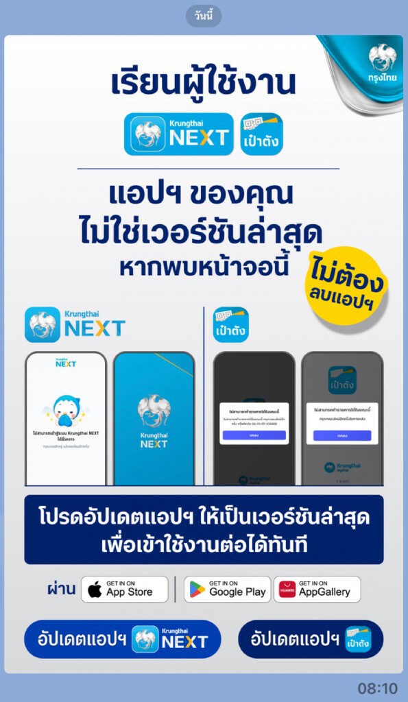 - กรุงไทย NEXT เวอร์ชั่นต่ำว่า 15.6.5
