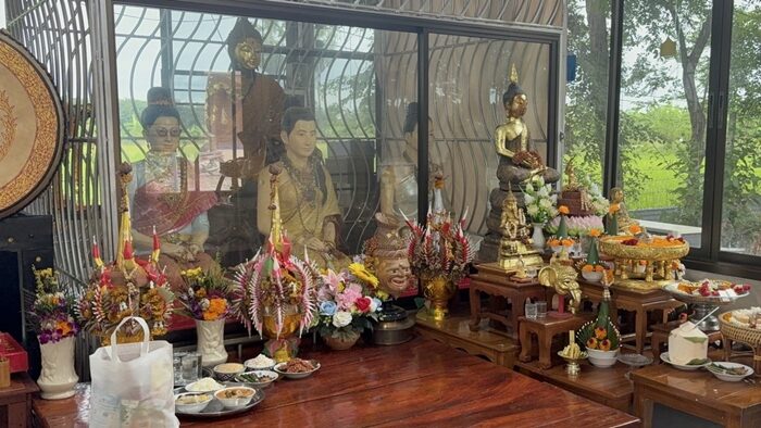 วันที่ 11 ก.ค.2568 ที่บริเวณสวนป่าบ้านเสาร์ 5 เลขที่ 129 ม.4 ต.สาวร้องไห้ อ.วิเศษชัยชาญ จ.อ่างทอง พบคนดวงเฮงได้นิมนต์พระมาทำบุญถวายสังฆทาน ให้กับแม่แก้วเรือนทอง ต้นตะเคียน ในห้องกระจกติดแอร์กันเป็นจำนวนมาก