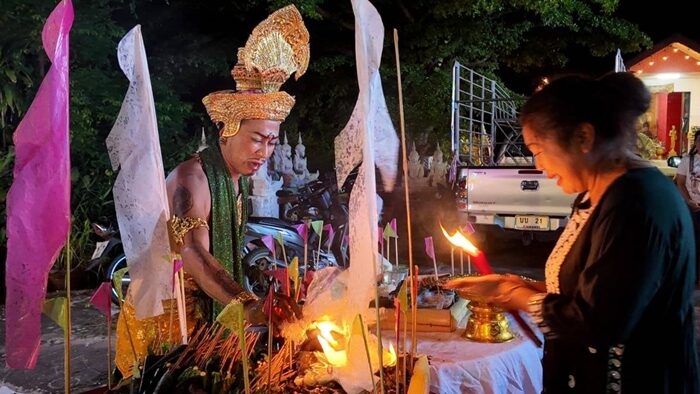 และประกอบพิธีสะเดาะเคราะห์ต่อชะตาแบบโบราณให้กับลูกศิษย์และผู้ร่วมพิธี โดยการทำสตวงใส่อาหารหวานคาว เขียนชื่อ นามสกุล และปั้นดินเหนียวเป็นหุ่นตัวแทน ซึ่งเมื่อการบวงสรวงเสร็จสิ้นร่างทรงพ่อปู่พญานาคจะทำการเผาทั้งหมดด้วยไฟเพื่อส่งเคราะห์ปัดเป่าสิ่งชั่วร้ายให้กลับกลายเป็นดีแก่ผู้มาร่วมพิธี