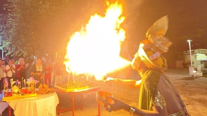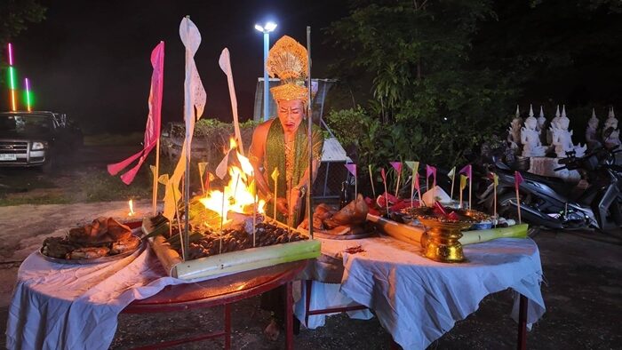 เมื่อพิธีการสะเดาะเคราะห์ได้เริ่มขึ้น หมอเอ วังนาคินทร์ (ร่างทรงปู่พญานาค) ได้ทำการจุดธูปและประกอบพิธีเผาสตวงที่มีหุ่นปั้นและกระดาษรายชื่อของผู้ร่วมพิธี จากนั้นได้ทำการพ่นไฟเผาสิ่งชั่วร้ายให้หายสิ้นไปและรับความโชคดี