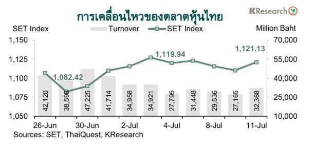 บริษัทหลักทรัพย์(บล.)กสิกรไทย จำกัดหรือKSecuritiesมองว่า ดัชนีหุ้นไทยมีแนวรับที่ 1,110 และ 1,100 จุด ขณะที่แนวต้านอยู่ที่ 1,130 และ 1,145 จุด ตามลำดับ ในวันศุกร์ที่ 11 ก.ค. 2568 ดัชนี SET ปิดที่ระดับ 1,121.13 จุด เพิ่มขึ้น 0.11% จากระดับปลายสัปดาห์ก่อน ขณะที่มูลค่าการซื้อขายเฉลี่ยต่อวันอยู่ที่ 30,128.95 ล้านบาท ลดลง 19.27% จากสัปดาห์ก่อน ส่วนดัชนี mai เพิ่มขึ้น 0.80% มาปิดที่ระดับ 236.42 จุด