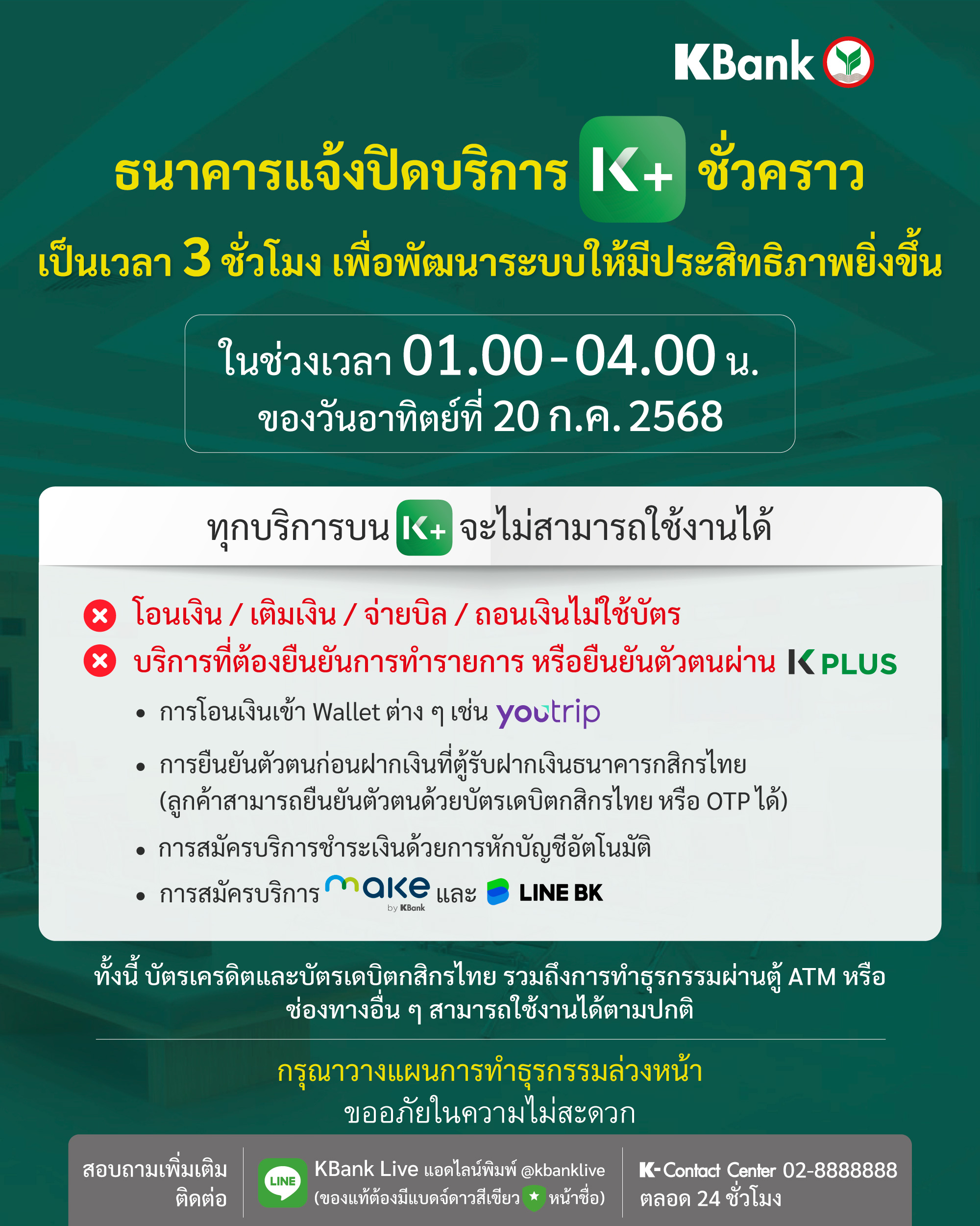 โดยธนาคารขอให้ผู้ใช้บริการ กรุณาวางแผนการทำธุรกรรมล่วงหน้า และ ขออภัยในความไม่สะดวก สอบถามข้อมูลเพิ่มเติมได้ที่ LINE KBank Live แอดไลน์พิมพ์ @kbanklive หรือ K-Contact Center โทร. 02-8888888 ตลอด 24 ชั่วโมง