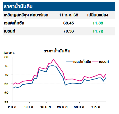 อย่างไรก็ตาม นักลงทุนยังจับตาท่าทีล่าสุดของประธานาธิบดีทรัมป์ ที่เตรียมแถลงนโยบายต่อรัสเซีย ในวันที่ 15 ก.ค. ขณะที่สหภาพยุโรปเตรียมเสนอร่างมาตรการคว่ำบาตรรอบใหม่ รวมถึงเพดานราคาน้ำมัน สร้างความกังวลด้านอุปทานและความผันผวนของตลาด