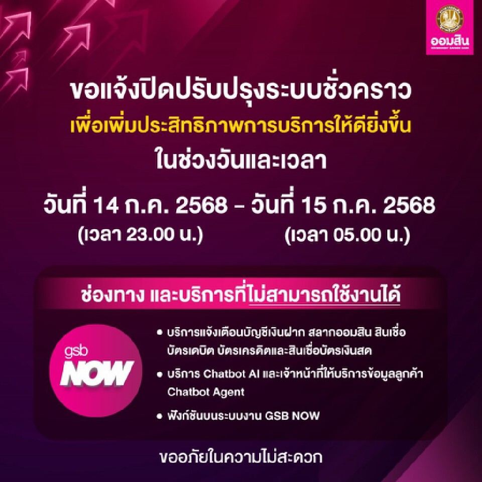 ที่มา : ธนาคารออมสิน แจ้งปิดปรับปรุงระบบ GSB Now วันที่ 14-15 ก.ค.68