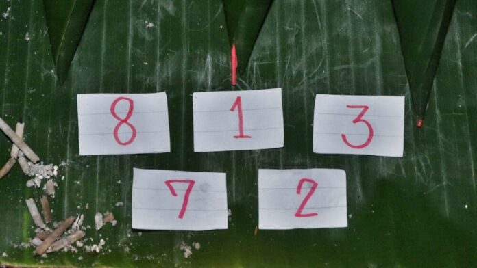 เมื่อวันที่ 14 ก.ค.68 ผู้สื่อข่าวรายงานว่า ที่หลังวัดโบสถ์ราษฎร์ศรัทธา ต.บางระกำ อ.โพธิ์ทอง จ.อ่างทอง นักเสี่ยงดวง นำพานดอกไม้ธูปเทียน กระดาษที่เขียนตัวเลข 1-10 จำนวน 3 ชุด