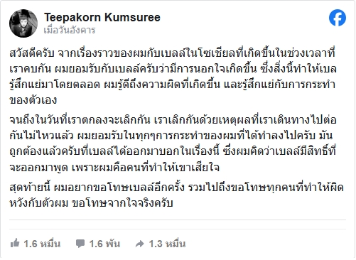 "สวัสดีครับ จากเรื่องราวของผมกับเบลล์ในโซเชียลที่เกิดขึ้นในช่วงเวลาที่เราคบกัน ผมยอมรับกับเบลล์ครับว่ามีการนอกใจเกิดขึ้น ซึ่งสิ่งนี้ทำให้เบลรู้สึกแย่มาโดยตลอด ผมรู้ดีถึงความผิดที่เกิดขึ้น และรู้สึกแย่กับการกระทำของตัวเอง จนถึงในวันที่เราตกลงจะเลิกกัน เราเลิกกันด้วยเหตุผลที่เราเดินทางไปต่อกันไม่ไหวแล้ว ผมยอมรับในทุกๆการกระทำของผมที่ได้ทำลงไปครับ มันถูกต้องแล้วครับที่เบลล์ได้ออกมาบอกในเรื่องนี้ ซึ่งผมคิดว่าเบลล์มีสิทธิ์ที่จะออกมาพูด เพราะผมคือคนที่ทำให้เขาเสียใจ สุดท้ายนี้ ผมอยากขอโทษเบลล์อีกครั้ง รวมไปถึงขอโทษทุกคนที่ทำให้ผิดหวังกับตัวผม ขอโทษจากใจจริงครับ"