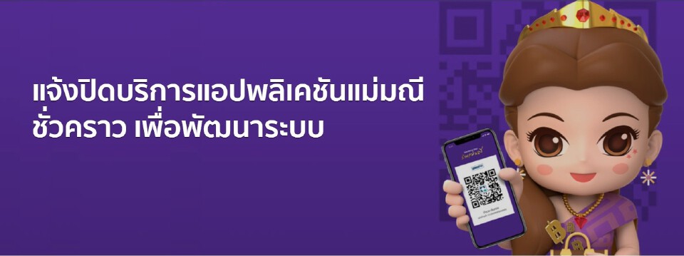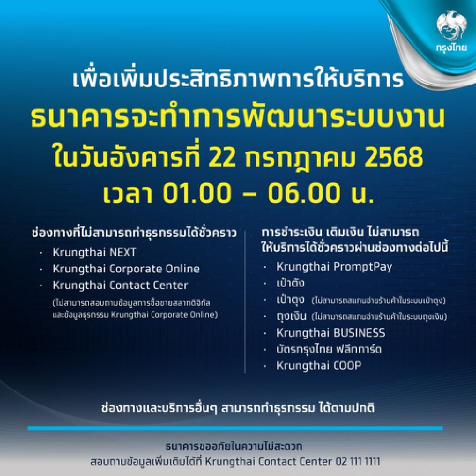 ธนาคารกรุงไทยจะทำการพัฒนาระบบงานเพื่อเพิ่มประสิทธิภาพการให้บริการในวันอังคารที่ 22 กรกฎาคม 2568 เวลา 01.00 - 06.00 น. โดยช่องทางที่ไม่สามารถทำธุรกรรมได้ชั่วคราว