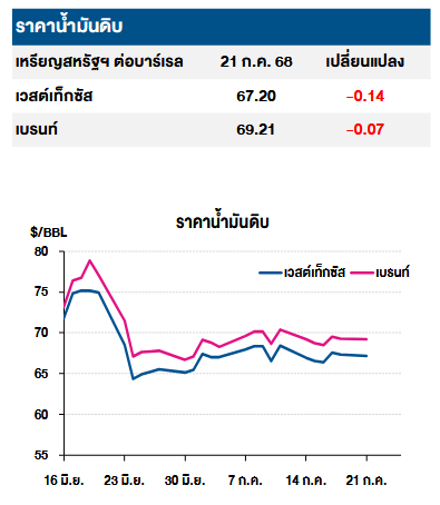 โดยราคาน้ำมันดิบเวสต์เทกซัสซื้อขายเมื่อ 21 ก.ค. 68 อยู่ที่ 67.20 เหรียญสหรัฐต่อบาร์เรล ลดลง -0.14 เหรียญสหรัฐ และราคาน้ำมันเบรนต์อยู่ที่ 69.21 เหรียญสหรัฐต่อบาร์เรล ลดลง -0.07 เหรียญสหรัฐ