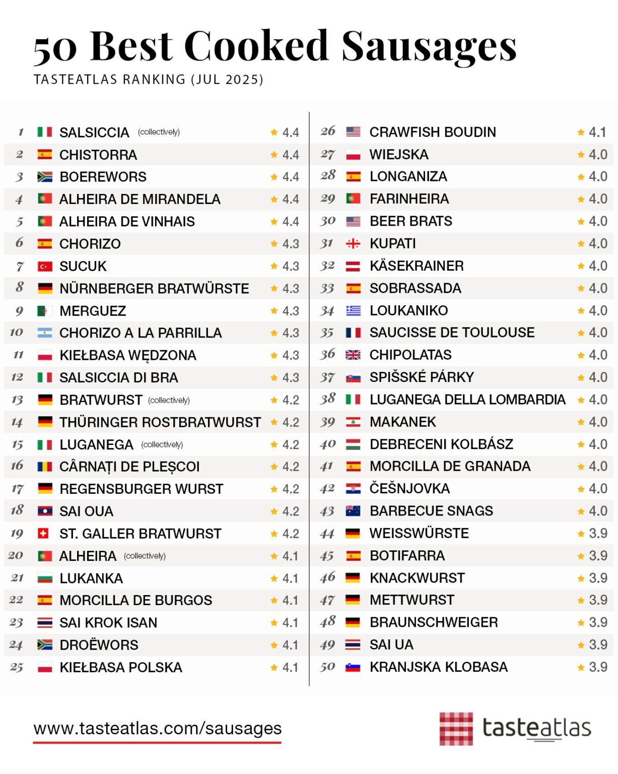 TasteAtlas เว็บไซต์ที่ให้ข้อมูลเกี่ยวกับอาหารท้องถิ่นทั่วโลก จัดอันดับ 50 เมนูไส้กรอก ที่อร่อยที่สุดในโลก ประจำเดือน ก.ค. โดยมีดังนี้