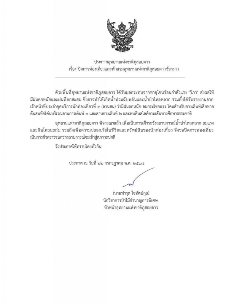 วันที่ 22 กรกฎาคม 2568 นายฟารุต ใจทัศน์กุล นักวิชาการป่าไม้ชำนาญการพิเศษ หัวหน้าอุทยานแห่งชาติภูสอยดาว ได้ออกประกาศอุทยานแห่งชาติภูสอยดาว เรื่อง ปิดการท่องเที่ยวและพักแรมอุทยานแห่งชาติภูสอยดาวชั่วคราว