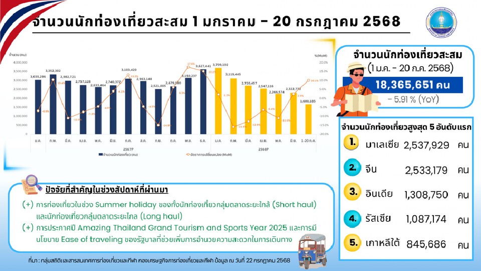 กระทรวงท่องเที่ยว อัปเดตสถานการณ์ท่องเที่ยวล่าสุด ตั้งแต่วันที่ 1 ม.ค.- 20 ก.ค. 2568 ไทยมีนักท่องเที่ยวต่างชาติทะลุ 18 ล้านคนแล้ว เปิด 5 ชาติเดินทางเข้าไทยสูงสุด เช็คเลย