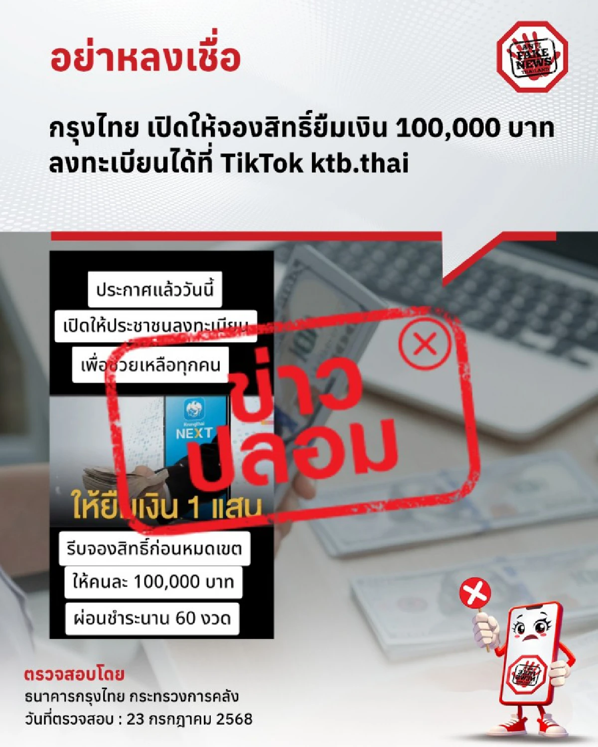 โฆษณาสินเชื่อที่เผยแพร่บนบัญชี TikTok ชื่อ ktb.thai ตามภาพข่าว เป็นการแอบอ้างนำโลโก้ของธนาคารกรุงไทยไปใช้โดยไม่ได้รับอนุญาต และธนาคารไม่มีนโยบายปล่อยสินเชื่อผ่านบัญชี TikTok แต่อย่างใด ขอประชาชนอย่าหลงเชื่อ และหากพบเห็นการโฆษณาปล่อยสินเชื่อในลักษณะนี้ ขอให้สันนิษฐานไว้ก่อนว่า เป็นมิจฉาชีพ