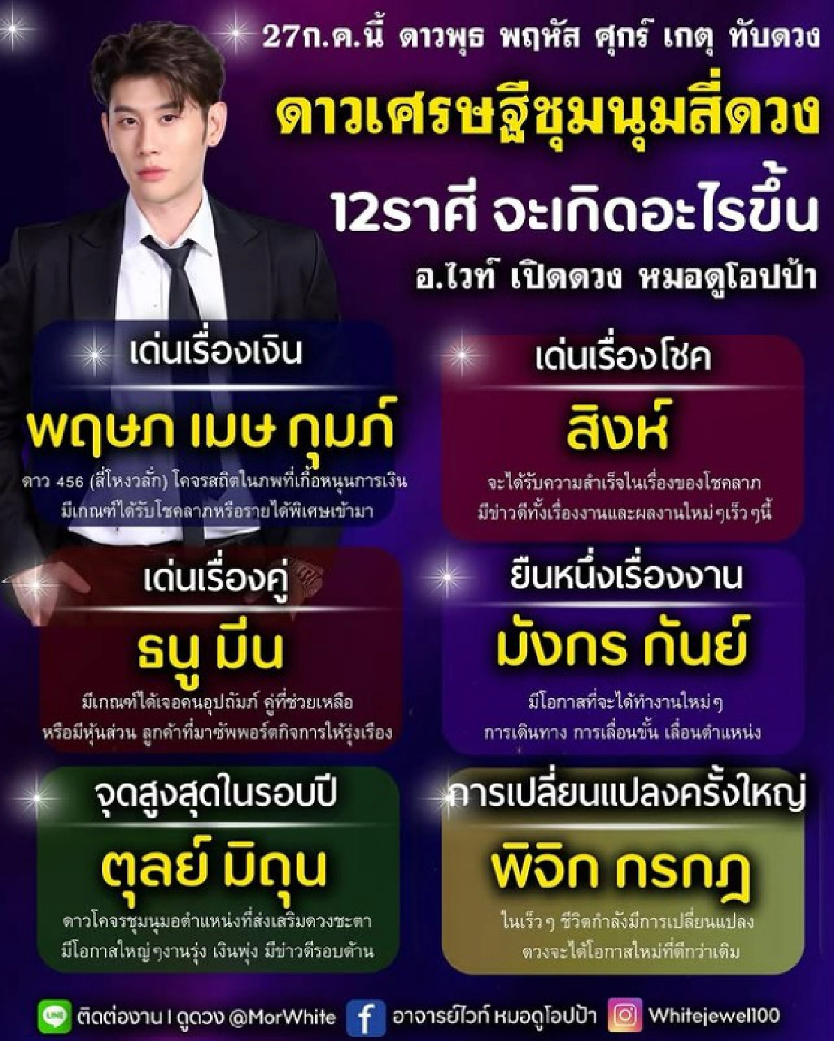 ซึ่งแต่ละราศีนั้นมีผลทำนายเป็นอย่างไรบ้างมาติดตามพร้อมกันเพราะ หมอไวท์ ชี้ว่า "ดาวเศรษฐีชุมนุมใหญ่"