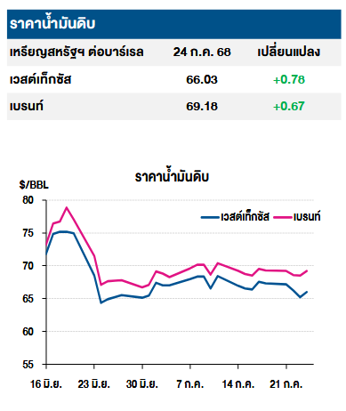 โดยราคาน้ำมันดิบเวสต์เทกซัสซื้อขายเมื่อ 24 ก.ค. 2568 อยู่ที่ 66.03 เหรียญสหรัฐต่อบาร์เรล เพิ่มขึ้น +0.78 เหรียญสหรัฐ และราคาน้ำมันดิบเบรนต์อยู่ที่ 69.18 เหรียญสหรัฐต่อบาร์เรล เพิ่มขึ้น +0.67 เหรียญสหรัฐต่อบาร์เรล
