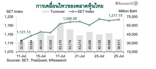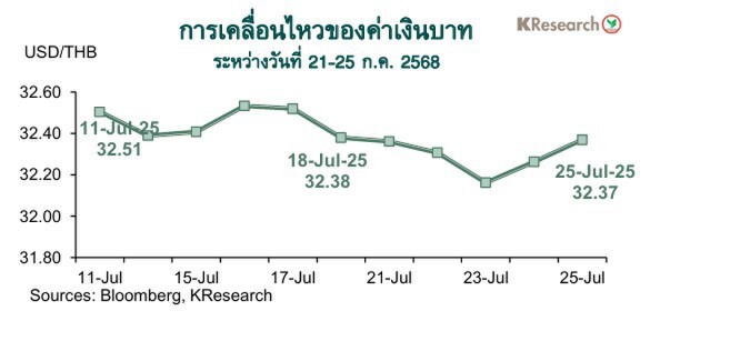 ศูนย์วิจัยกสิกรไทยประเมินปัจจัยสำคัญที่ต้องติดตาม ได้แก่ ผลการเจรจาการค้าของสหรัฐฯ กับไทย ผลการประชุม FOMC (29-30 ก.ค.) และ BOJ (30-31 ก.ค.) รวมถึงฟันด์โฟลว์ของต่างชาติ ทิศทางราคาทองคำในตลาดโลก และรายงานเศรษฐกิจและการเงินเดือนมิ.ย. ของไทย
